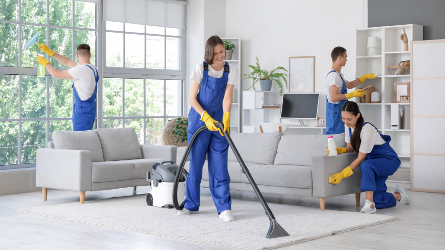 На уборку коттеджа выезжает бригада сотрудников со всем необходимым оборудованием и инвентарем (пылесосы, парогенераторы, чистящие средства, стремянки, расходные материалы). В каждой команде есть бригадир, который контролирует работы на объекте от начала уборки до момента сдачи работ заказчику.